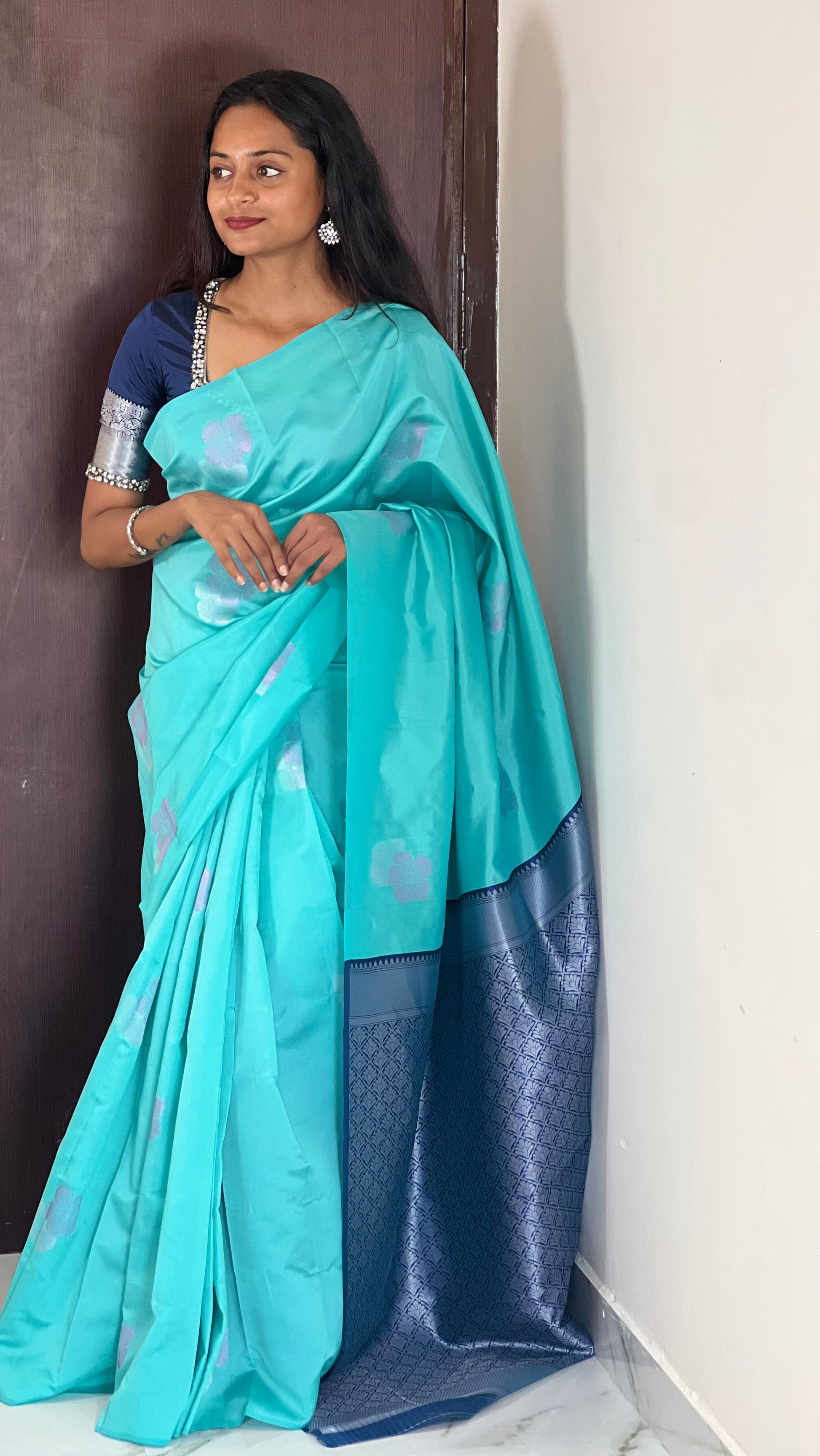🌸🌸Graceful and elegant, this turquoise Kanchi semi-silk saree features delicate woven floral motifs across the body. The rich navy blue zari-woven border and pallu add a striking contrast, giving it a timeless traditional charm. Paired with a navy blue contrast blouse highlighted with silver zari sleeves, this ensemble beautifully blends tradition with modern finesse.