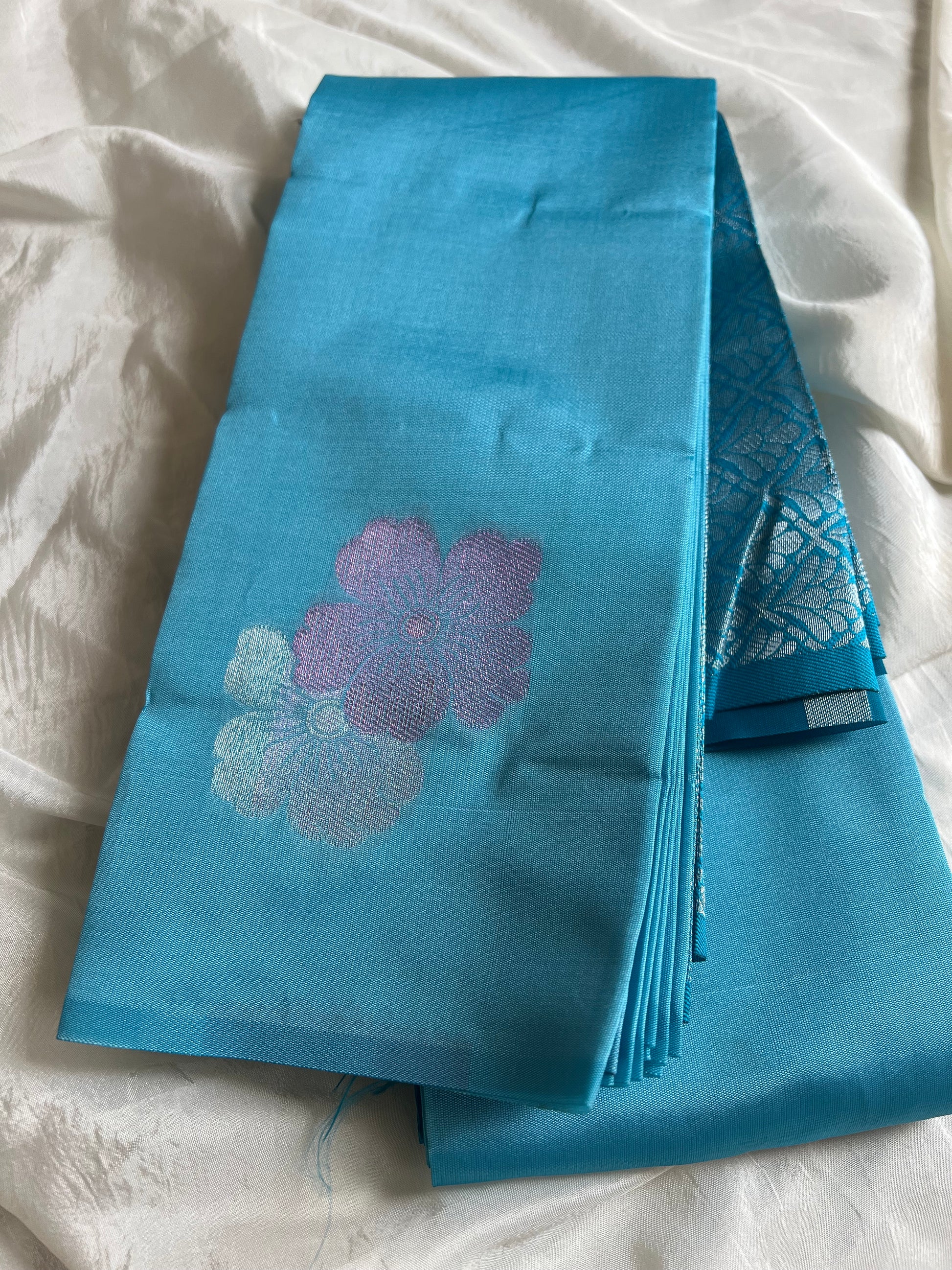 🌸🌸Radiating freshness and charm, this aqua blue Kanchi semi-silk saree is adorned with subtle woven floral motifs in pastel tones. The contrast zari-woven border and pallu in elegant blue hues bring out a perfect balance of vibrance and tradition. Lightweight yet rich in look, this saree drapes beautifully, making it an ideal pick for festive gatherings, weddings, and special occasions.