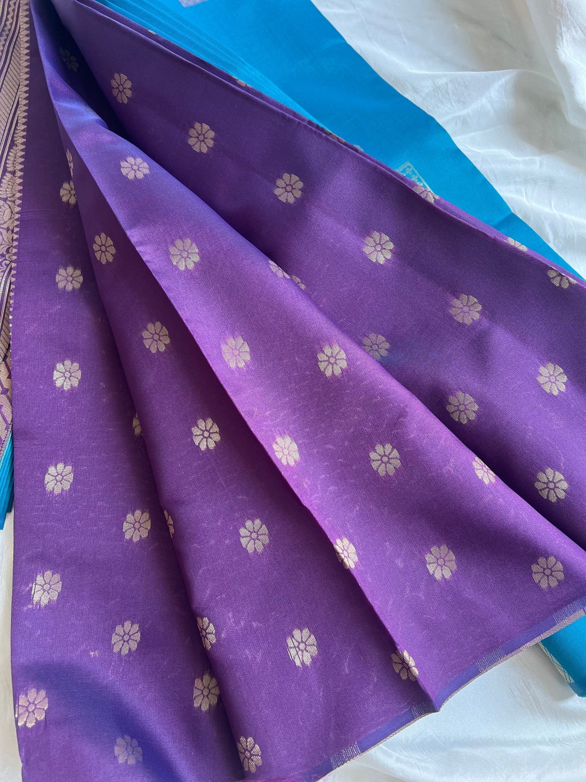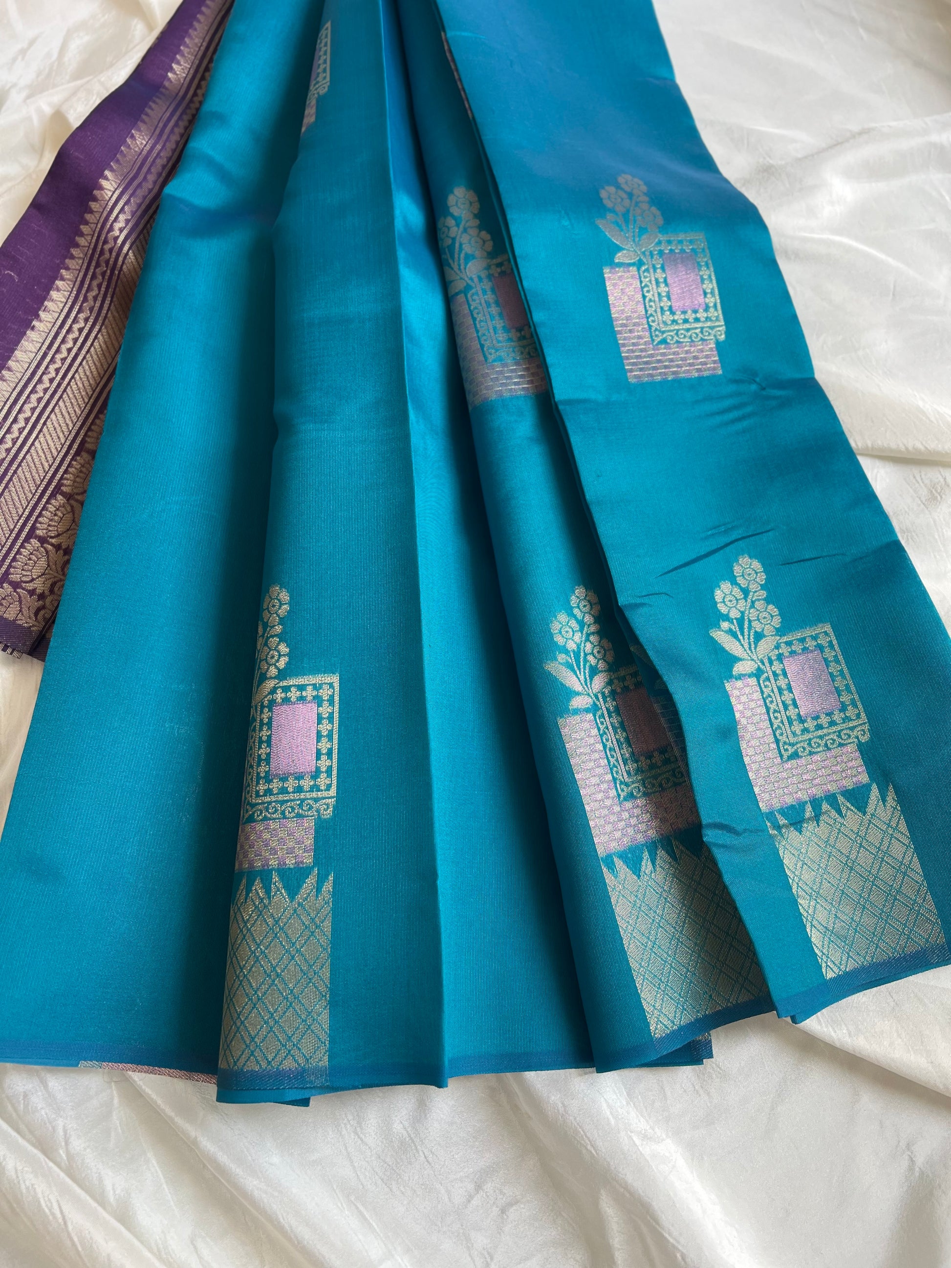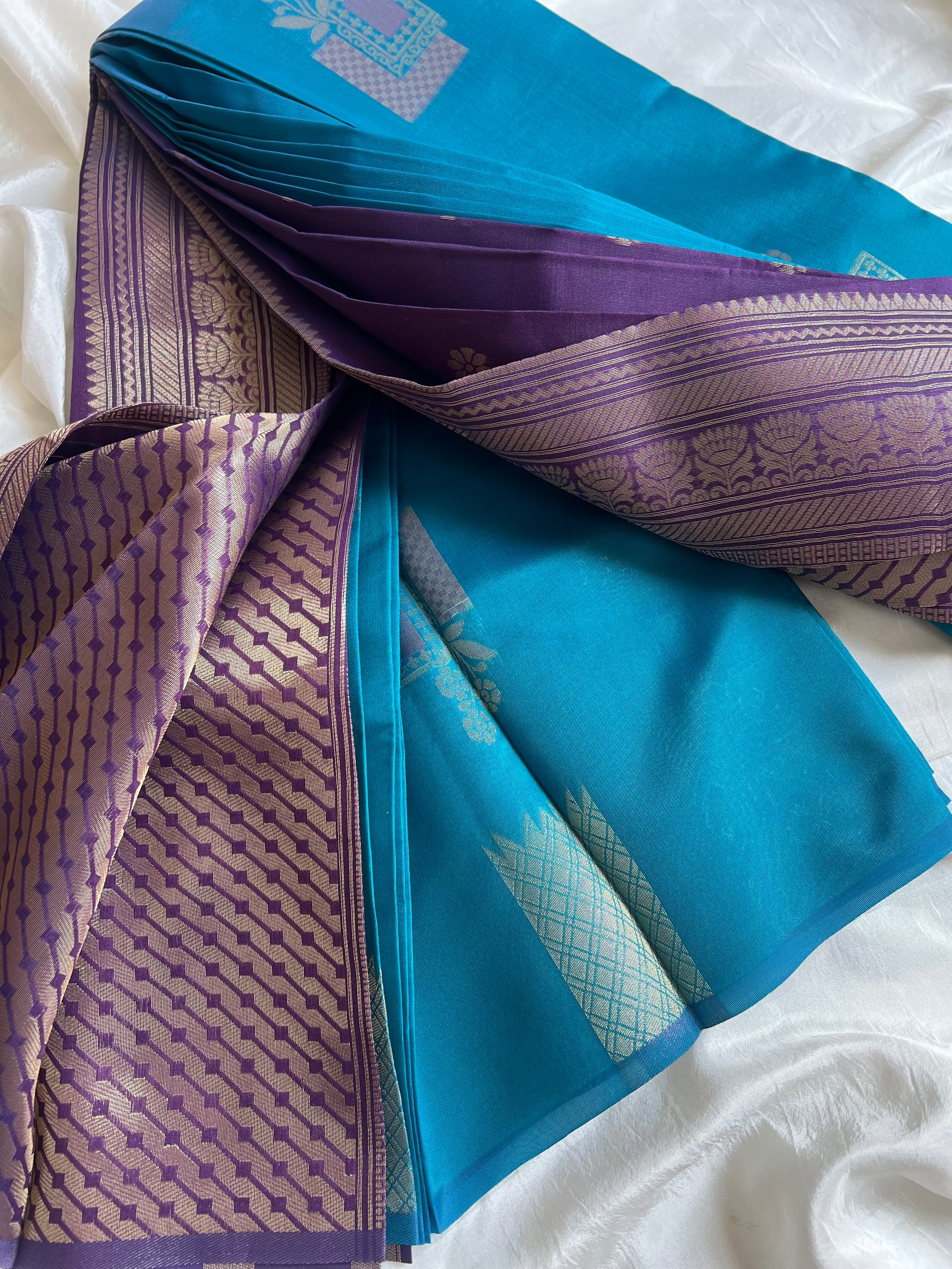 A masterpiece of contrast, this Kanchi semi-silk saree comes in a regal peacock blue dial shade body highlighted with intricate zari motifs, paired with a vibrant purple pallu adorned with geometric patterns. The body is embellished with elegant zari buttas, while the contrasting shades create a striking balance of richness and vibrance.