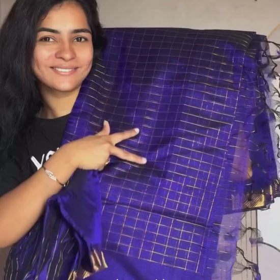A stunning woven in luxurious soft semi silk. The rich body is elegantly balanced with subtle contrasting checks , making it perfect for festive occasions and celebrations. Lightweight yet grand, this saree drapes beautifully, giving you both comfort and regal charm.
