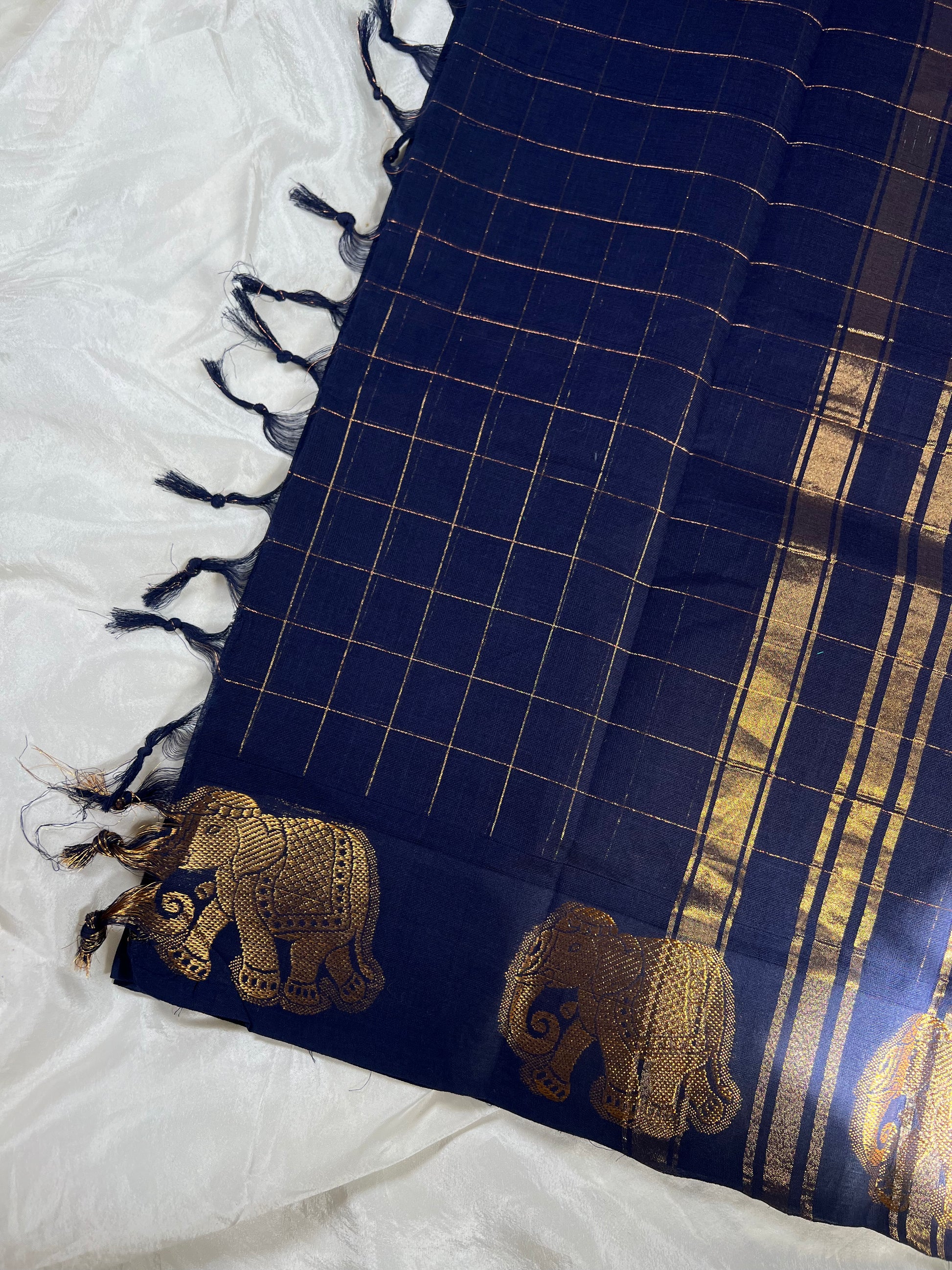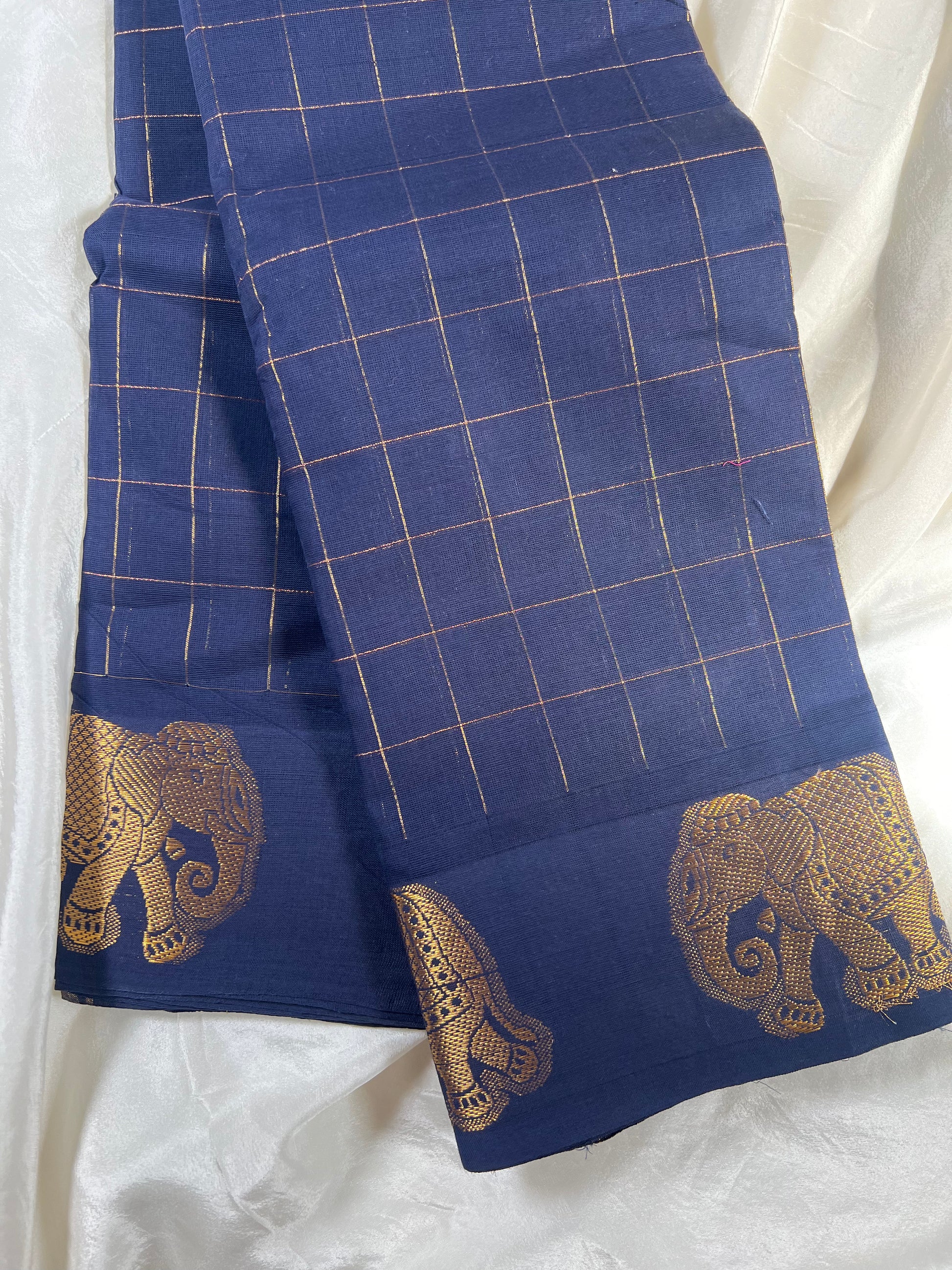 A soft cotton handloom saree in rich colors, featuring elegant checks, golden zari detailing, and a beautiful elephant motif border.