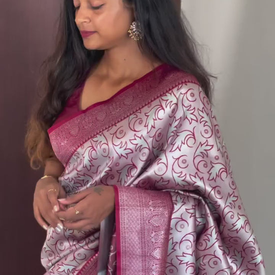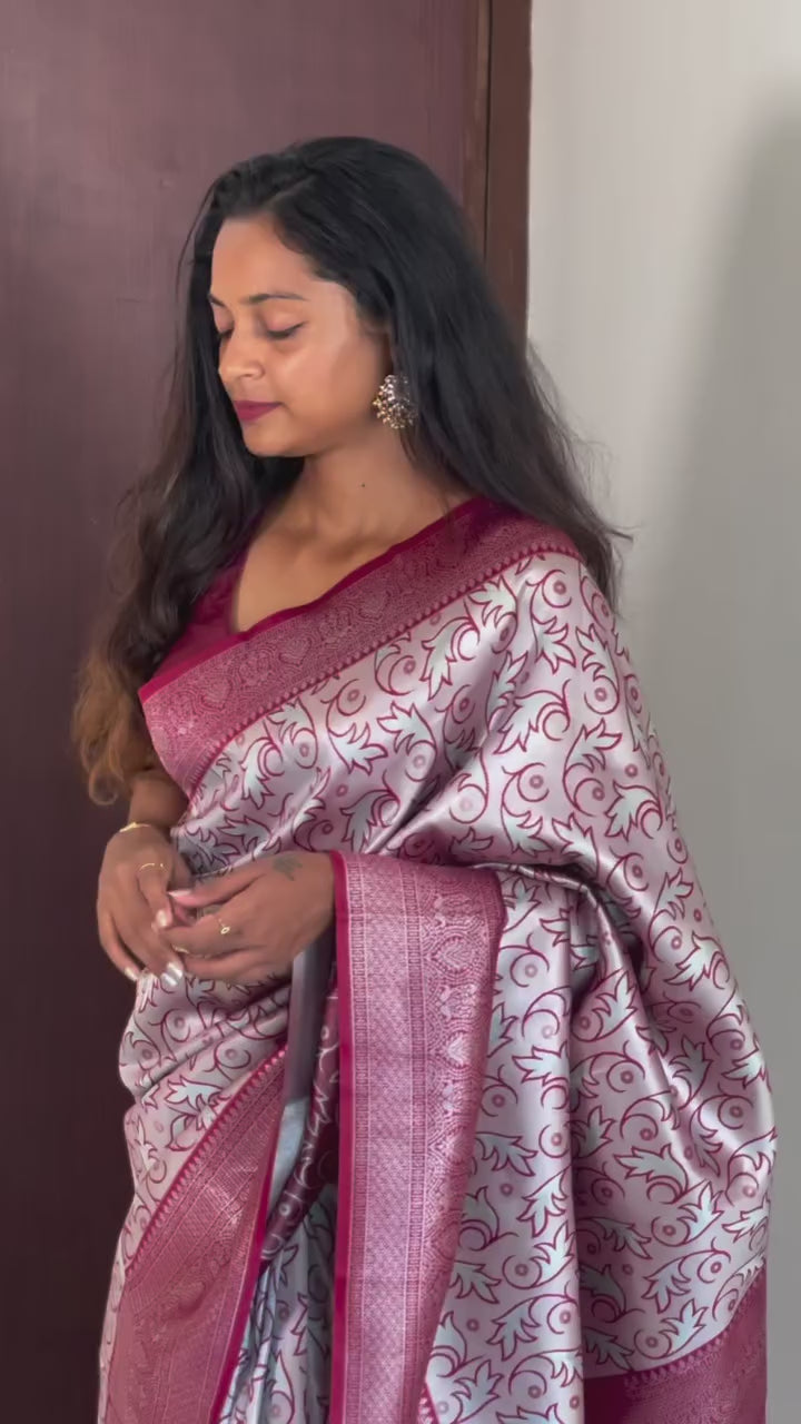 A regal maroon semi Kancheepuram silk saree, highlighted with silver . The subtle zari work and soft sheen make it an ideal choice for weddings and evening celebrations ❗️