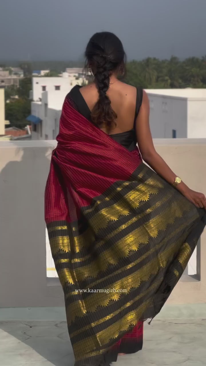 Crafted in semi silk with a rustic maroon orange stunning zari checks and black temple border,this lightweight saree is a celebration of elegance and comfort.Perfect for any occasion,it's a must-have addtion to your wardrobe.