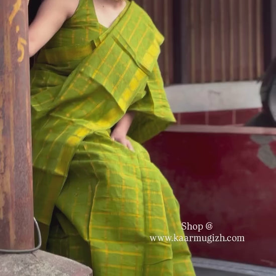 Crafted in pure cotton with a stunning s zari checks and border,this lightweight saree is a celebration of elegance and comfort.Perfect for any occasion,it's a must -have addtion to your wardrobe.